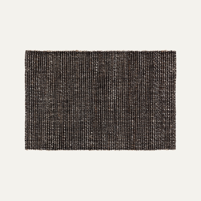 Handspunnet och maskinvävt jutegarn vävs för hand till en matta med mixad struktur i både väv och färgsättning. Undersida bestruken med naturlatex.